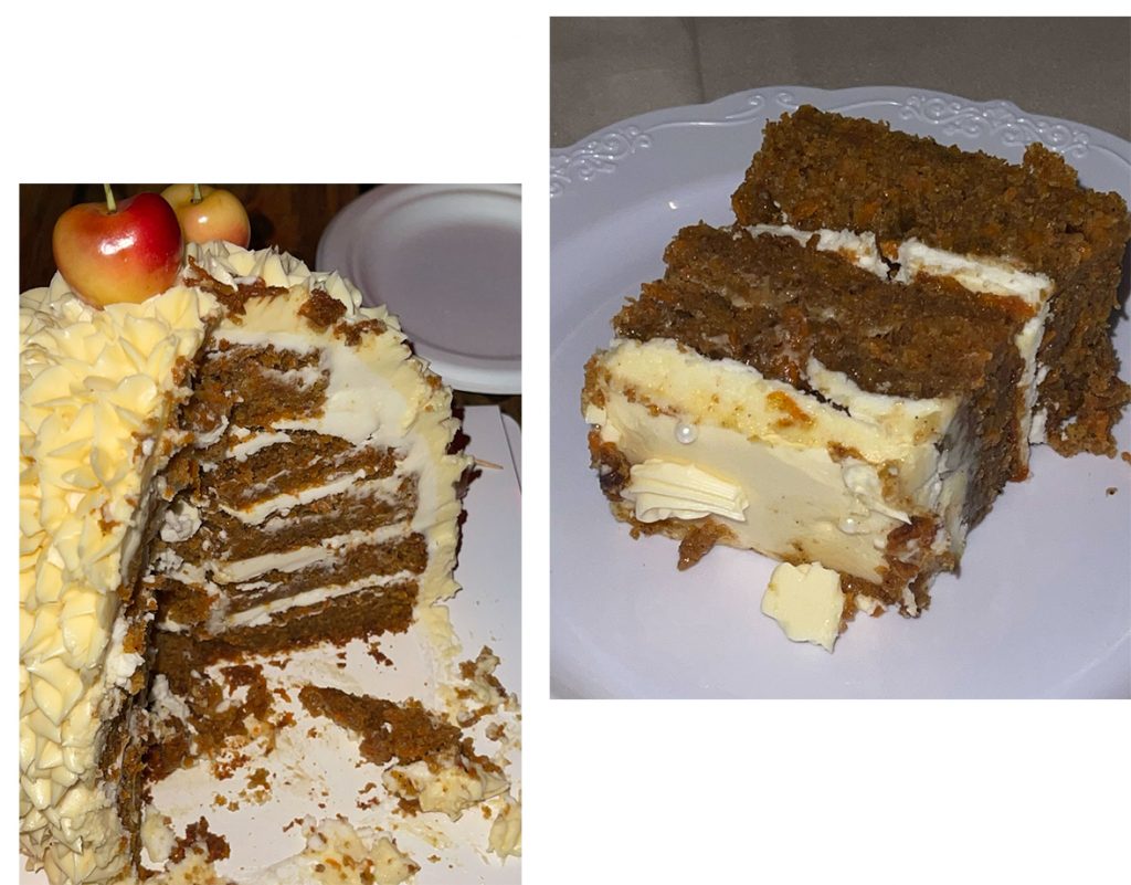 spiced carrot cake / tangy cream cheese filling / vanilla or cinnamon swiss meringue buttercream